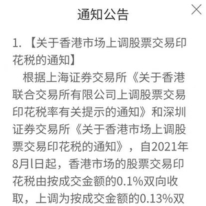 上交所通知表示,根据香港联合交易所有限公司(以下简称联交所)上调股票交易印花税公告,自2021年8月1日起,香港市场的股票交易印花税由按成交金额的0.1%双向收取,上调为按成交金额的0.13%双向收取(取整到元,不足一元按一元计)。按照《上海证券交易所沪港通业务实施办法》第七十六条的有关规定,投资者进行沪港通下的港股通交易,应按照联交所市场的有关规定交纳相关费用。