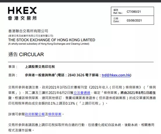 2021年2月24日,香港特区政府财政司司长陈茂波表示,我们充分考虑对证券市场和国际竞争力的影响后,决定提交法案调整股票印花税税率,由现时买卖双方按交易金额各付百分之零点一,提高至百分之零点一三。