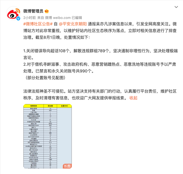 8月1日晚上22时,@微博管理员发布微博社区公告称,自 @平安北京朝阳 通报吴亦凡涉案信息以来,引发全网高度关注。微博站方对此非常重视,以维护好站内社区生态秩序为落点,立即对相关信息进行了排查治理。截至8月1日晚,处置情况如下: