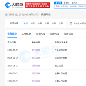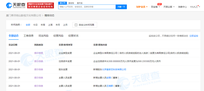 据天眼查APP显示,7月30日,厦门泰洋明山影视文化有限公司发生工商变更,新增股东北京爱奇艺科技有限公司,同时注册资本从500万人民币变更为约588万人民币。