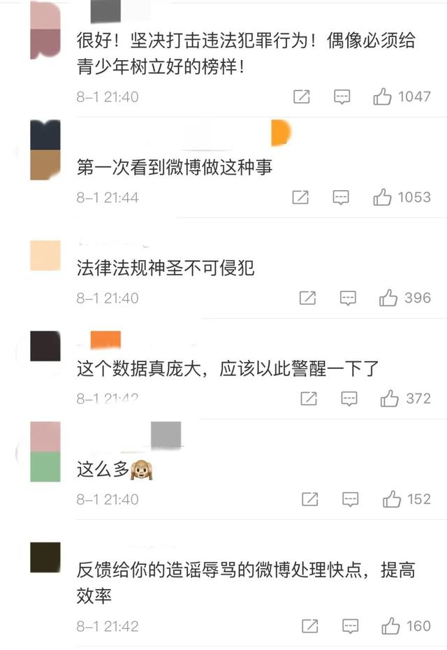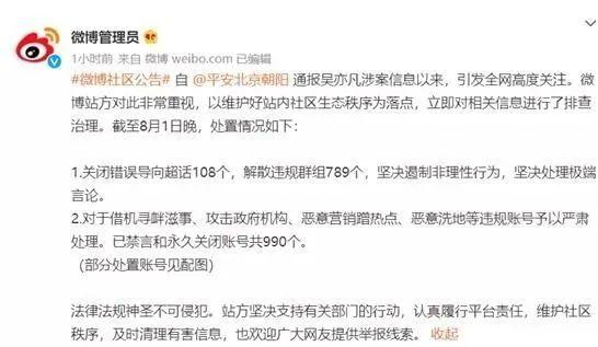 昨晚10时,@微博管理员 发布微博社区公告称,自 @平安北京朝阳 通报吴亦凡涉案信息以来,引发全网高度关注。微博站方对此非常重视,以维护好站内社区生态秩序为落点,立即对相关信息进行了排查治理。截至8月1日晚,处置情况如下: