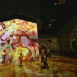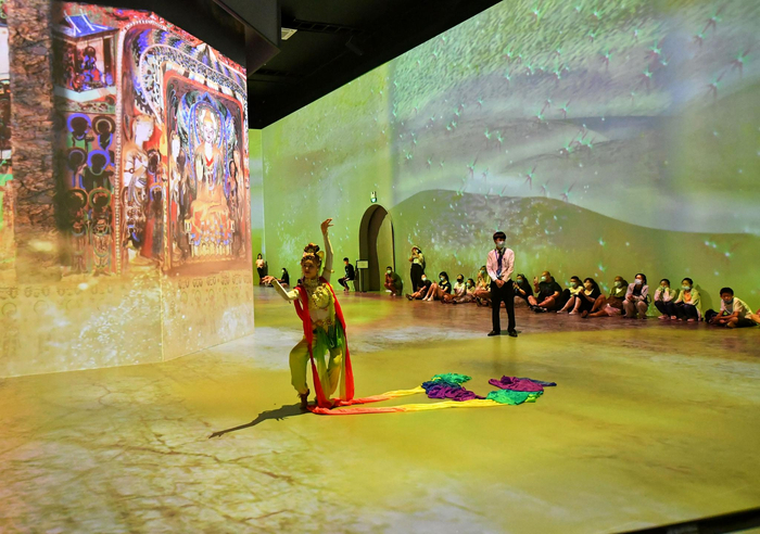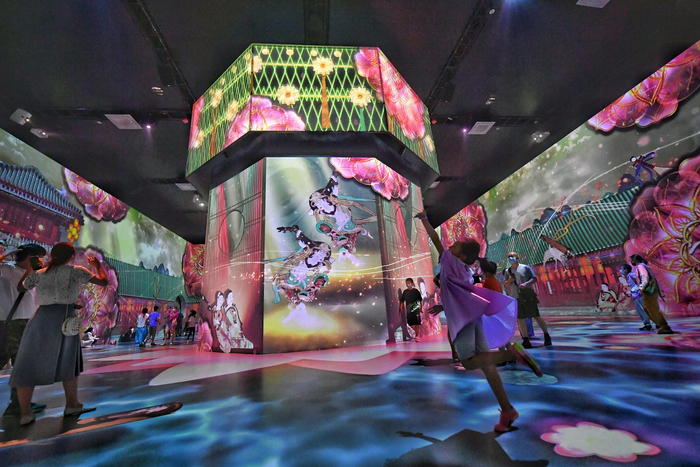 “遇见敦煌·光影艺术展”和“2021亚洲数字艺术展”是此次北京数字经济体验周华熙LIVE·五棵松打卡点的一部分。“遇见敦煌”的主办方北京中创文旅集团董事长秋童介绍,该展览借助200余幅孙博、鲍营等艺术大家重绘的敦煌壁画作品,通过动静结合的数字光影展陈方式,带领观众探寻敦煌长久不变的智慧。展览建筑空间高12米,总面积超1500平米,投射面积达2000平米,规模化地启用了484K超清投影机,由日本知名数字光影创作团队NAKED提供技术支持。