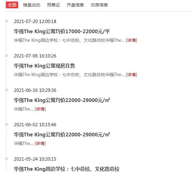 在某房产网站楼盘动态显示,天惠公寓2020年1月份均价12000元/平方米,到2020年4月时均价显示11000元/平方米;华强城The King公寓2021年6月均价22000元-29000元/平方米;到7月时,均价已调整至17000元-22000元/平方米。