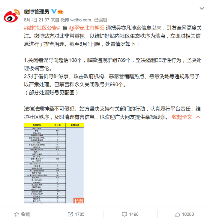 微博8月1日晚亦公告,通报吴亦凡涉案信息以来,引发全网高度关注,微博立即对相关信息进行了排查治理,关闭错误导向超话108个,解散违规群组789个,坚决遏制非理性行为,坚决处理极端言论;对于借机寻衅滋事、攻击政府机构、恶意营销蹭热点、恶意洗地等违规账号予以严肃处理。已禁言和永久关闭账号共990个。