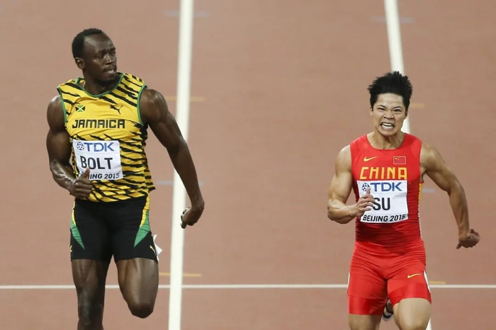 博尔特迈出一步,能比苏炳添多出30公分,苏炳添只能靠拼命更快速地摆腿来缩短二者之间的差距。有人算过,如果博尔特如果可以以苏炳添的步频跑一百米,那他能跑出8.46秒的极限成绩,比自己创造的9秒58的世界纪录还快了一秒多。