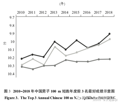图3显示,自2010年以来,我国男子100 m短跑年度前3名的最好成绩均呈现提高趋势,2018年前2名成绩都在10 s内。得益于大批优秀100 m短跑运动员的集中涌现,良性团队竞争模式在提高运动员成绩方面取得了非常好地效果,属于100 m短跑发展的结构性措施。
