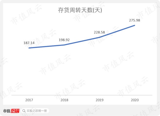 存货周转天数从2017年的187.14天一路上涨至2020年的275.98天。