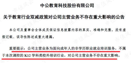 以公务员考试培训著称的中公教育(002607.SZ),则在深交所公告称,公司主营业务是面向成年人的非学历职业教育,目前没有开展K12阶段的学科类培训业务,因此,不受政策影响。