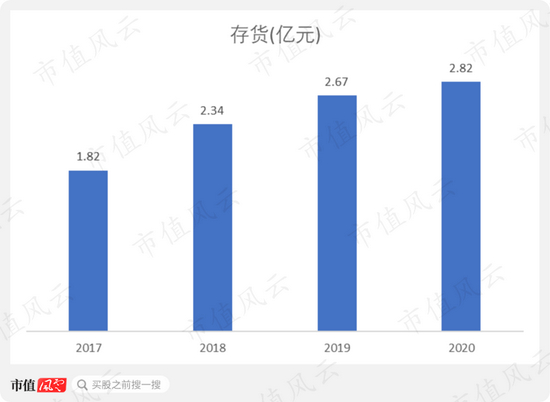 海伦钢琴的存货从2017年的1.82亿元上涨至2020年的2.82亿元。