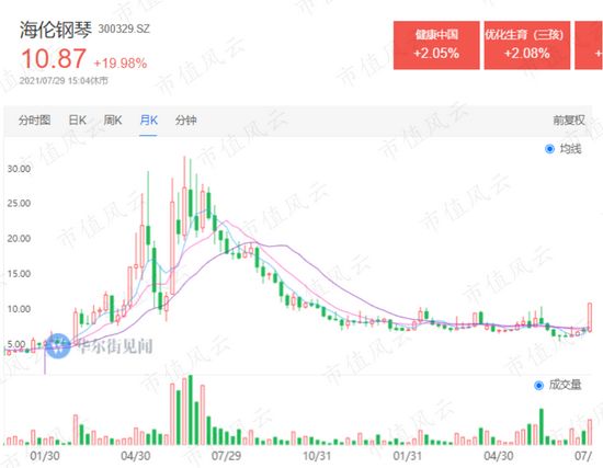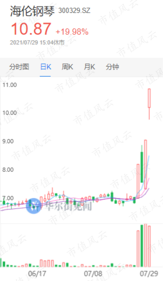 像风云君今天要重点介(扒)绍(皮)的海伦钢琴(300329.SZ),就是在最近的4个交易日(截至7月29日收盘),收获了3个20%的涨停板,已经迎风成妖。
