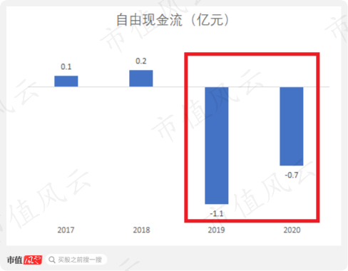 自由现金流也在2019年和2020年分别净流出1.1和0.7亿元。很明显,海伦钢琴的账上资金是越来越吃紧的。
