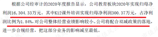 比如,科德教育(300192.SZ)的主营业务是向非义务教育阶段的学生提供职业教育,根据公司发布的风险提示性公告,2020年科德教育的K12课外培训业务实现利润300万元左右,占公司净利润的比例只有1.84%,比例非常低,受政策的影响比较有限。