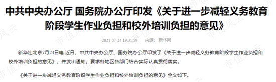 中国教育板块近日普跌的导火索是一则官方发布的重磅文件,即《关于进一步减轻义务教育阶段学生作业负担和校外培训负担的意见》。