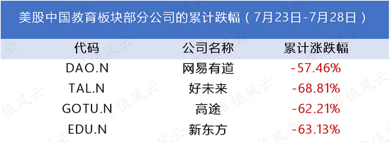 风云君整理了一下,美股方面,网易有道、新东方、好未来等,近几个交易日的跌幅都在60%左右,几个头部教育中概股股价,几乎都跌到个位数。