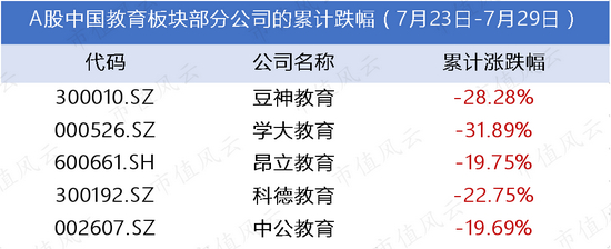 A股这边,像豆神教育(300010.SZ)、学大教育(000526.SZ)等,都是比较典型的K12校外培训教育类公司,跌幅基本都在30%左右,科德教育、中公教育等,情况稍好一点,跌幅在20%左右。