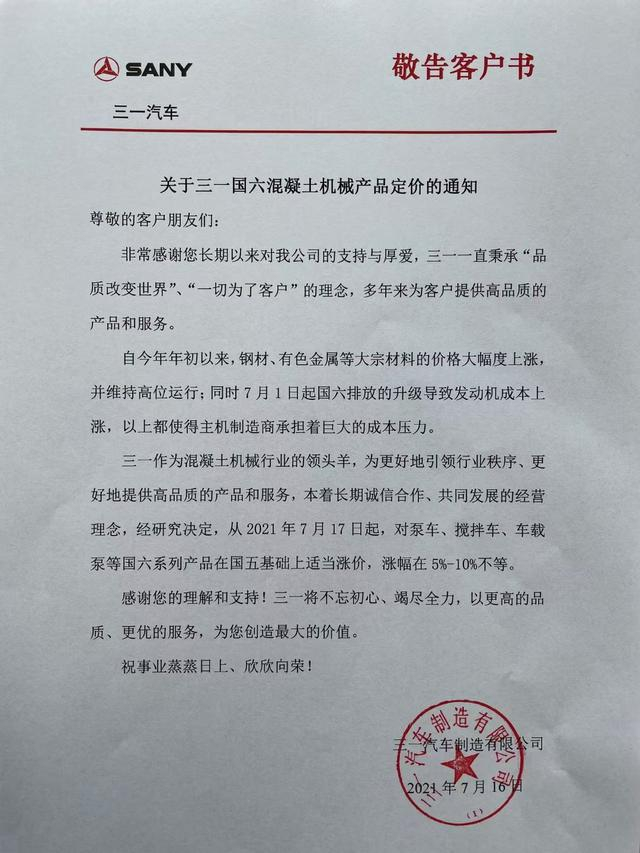 三一重工决定,从2021年7月17日起,对泵车、搅拌车、车载泵等国六系列产品在国五基础上适当涨价,涨幅在5%-10%不等。