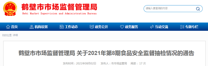 中国质量新闻网讯 2021年8月2日,河南省鹤壁市市场监督管理局网站发布关于2021年第8期食品安全监督抽检情况的通告。