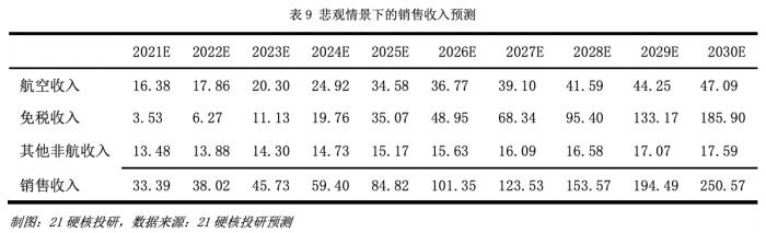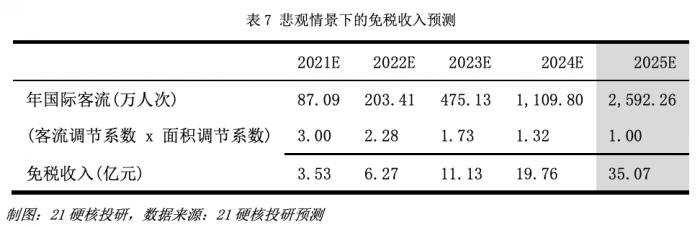 2、当月实际国际客流>2019年月均实际国际客流×80%时,月实际销售提成根据国际客流量所在的区间,计算相应的保底销售提成。然而从公告中得知,最低的客流区间为“X≤4172万人次”,对比上述对国际客流量的预测可知,无论是乐观情景还是悲观情景,国际客流量都很难在2025年前超过最低区间,因此在疫情恢复后的合同期内,上海机场的免税收入应基于最低保底销售提成计算。