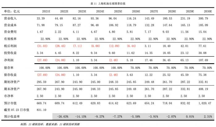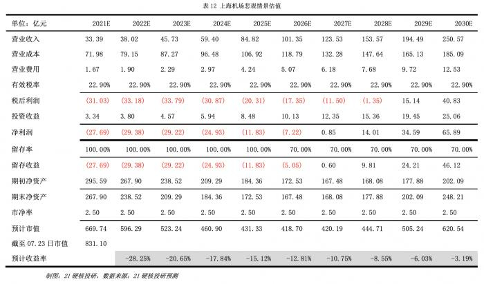 上海机场的总营业费用率极低,在2020年前基本保持在5%以下,预计2021~2030年总营业费用率仍保持在5%。上海机场同时通过投资子公司每年赚取稳定的投资收益,这部分收益占总收入的比重长期稳定在10%左右,因此预计2021~2030年,上海机场对联营企业和合营企业的投资收益保持在收入的10%。对于公司的留存率,参考公司过往的分红率保持在30%左右,而疫情期间公司现金流紧张,因此预计2021~2025年,上海机场留存率为100%,2025~2030年留存率则为70%。而估值则参考公司过往估值情况,采用2.5倍PB保守估计。