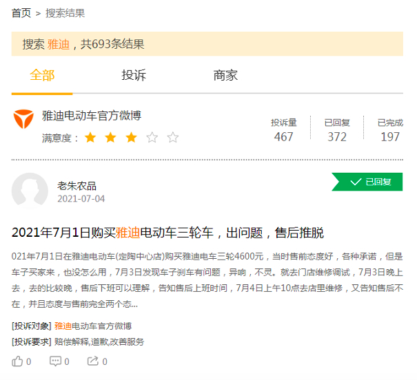 在黑猫投诉、百度贴吧等平台上,关于雅迪的投诉有很多。近期出现频率比较高的几个问题有线上渠道客服不回复、丢车包赔服务不履行、售后维修点乱要价等,服务、质量问题均沾。