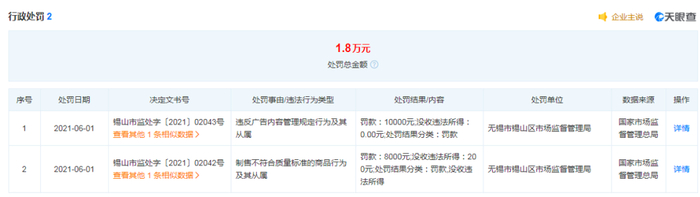 同时,据天眼查App显示,雅迪控股公司江苏大猴电子商务有限公司有两则行政处罚,违法行为类型分别为制售不符合质量标准的商品、违反广告内容管理规定,处罚总金额1.8万元。