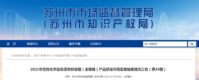 江苏省苏州市市场监管局:2批次危险化学品包装物和容器(金属桶)产品不合格