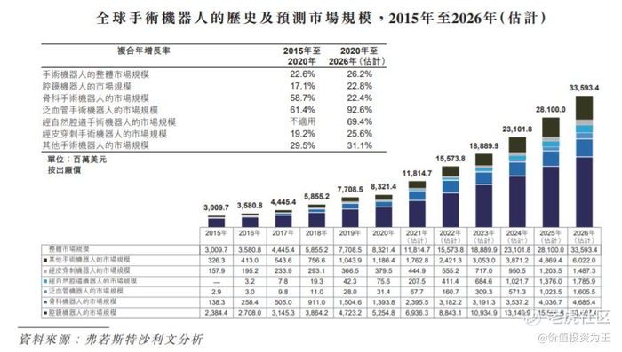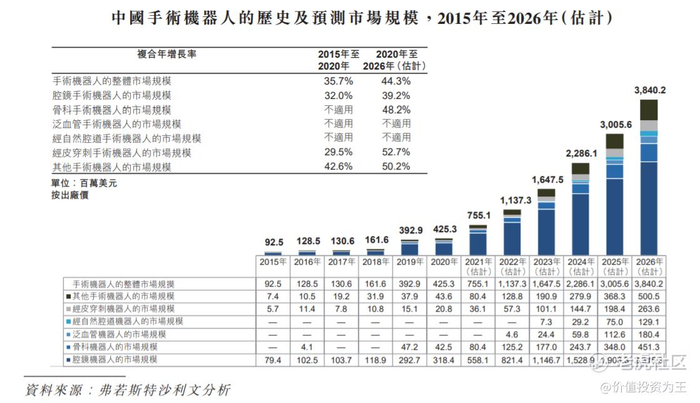 根据弗若斯特沙利文的预测,2020年我国腔镜手术机器人的市场规模仅3亿美元,预估到2026年将增长至23亿美元,年复合增速高达39.2%!