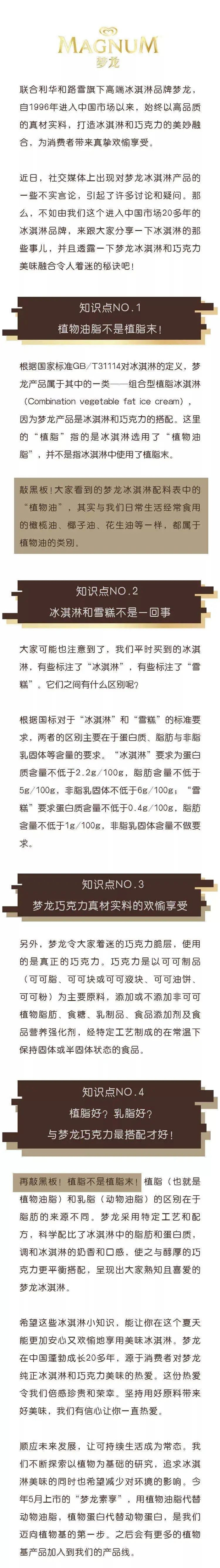 梦龙称,根据国家标准GB/T31114对冰淇淋的定义,梦龙产品属于其中的一类——组合型植脂冰淇淋。因为梦龙产品是冰淇淋和巧克力的搭配。