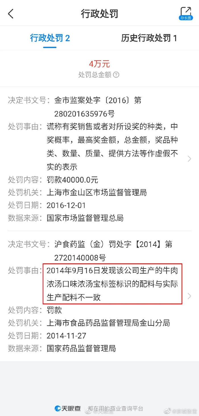 值得一提的是,联合利华食品(中国)有限公司也曾因“标签标识的配料与实际生产配料不一致”被行政处罚。
