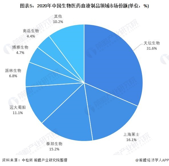 从血液制品领域来看,主要产品包含人血白蛋白、免疫球蛋白、人凝血因子Ⅷ、人凝血酶原复合物和人纤维蛋白原。按批签发量统计,2020年我国生物医药行业以天坛生物批签发量数量最多,占比高达31.6%;其次是上海莱士,批签发量占比为16.1%。