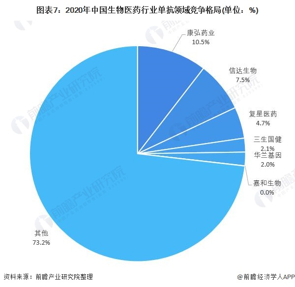 在单克隆抗体领域,行业集中度不高,康弘药业市场份额占比约为10.5%,其次是信达生物、复星医药,市场占比分别为7.5和4.7%。
