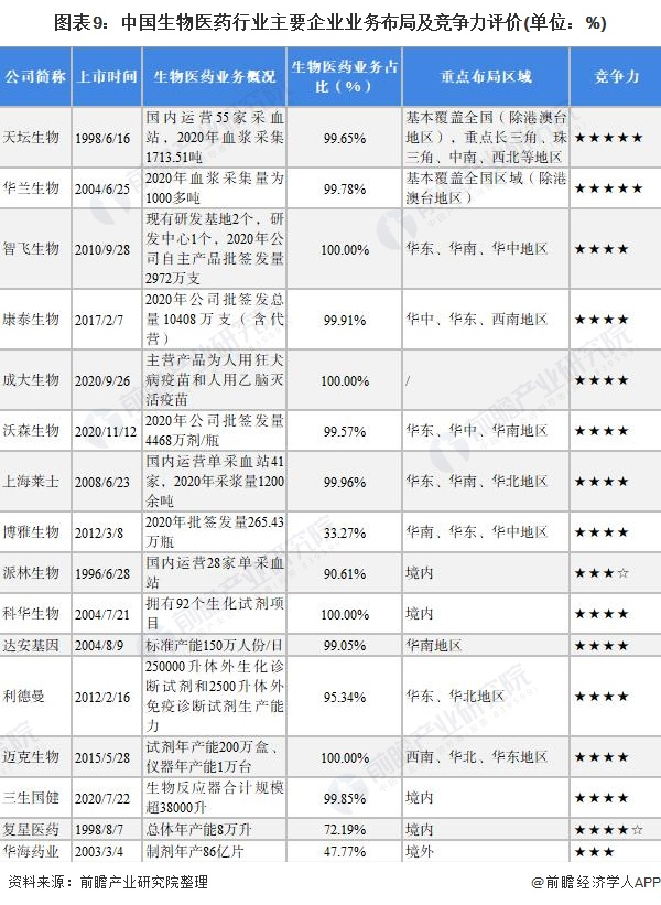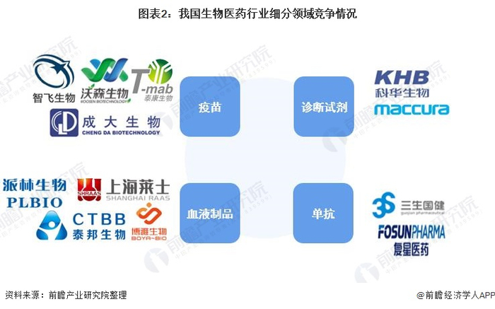 生物医药行业是国家战略性新兴产业,也是医药行业的重要组成部分。从细分领域来看,综合性经营的企业以国药集团(含中生集团下属研究所、天坛生物)、华润医药、上海医药、华兰生物为主,疫苗领域以科兴控股、智飞生物、沃森生物、康泰生物等企业为主,血液制品领域以泰邦生物、上海莱士、远大蜀阳等企业为主;诊断试剂领域以达安基因、科华生物等企业为主。