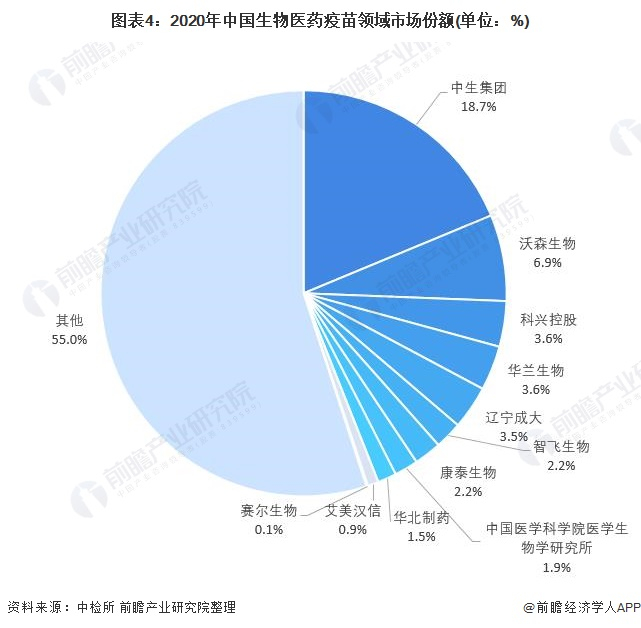 从疫苗领域来看,按批签发量统计,中国疫苗领域批签发量集中度不高,其中,中生集团疫苗批签发量占比最高,为18.7%,包含旗下成都、上海、兰州、北京等制所;第二位是沃森生物,2020年批签发量占比6.9%。