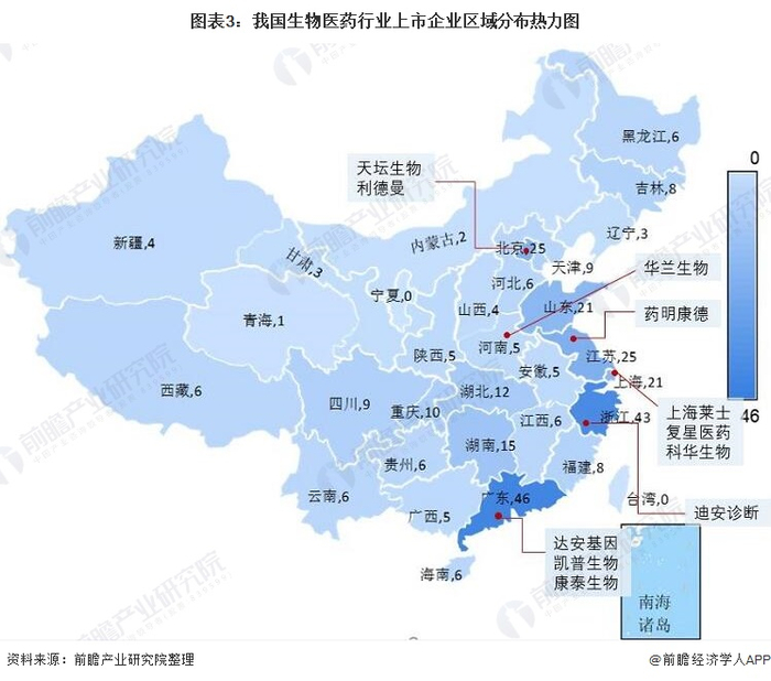 生物医药行业的上市公司中,天坛生物以及华兰生物的生物医药业务布局最广,这两家企业重点布局在长三角、珠三角地区。