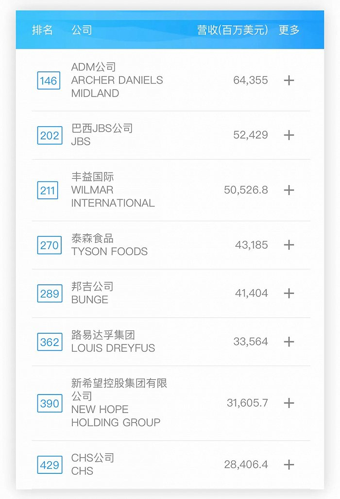 由于新希望的强势加入,这一子榜单的企业数量今年达到了8家。其中,第1到第6名的排位和去年一样,依次是:ADM公司、巴西JBS公司、丰益国际、泰森食品、邦吉公司、路易达孚集团,并且颇为惊艳的是,这些公司都实现了名次提升。唯一出现名次下滑的是CHS公司,今年排名第429在新希望之后。