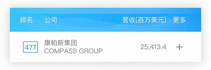 康帕斯集团在2020年的营收254.134亿美元(去年上榜的2019年营收:317.357亿美元),在500强中排第477名(去年排名:第395)。资料显示,康帕斯自1995年进入中国市场,目前为众多中国客户提供餐饮服务,包括提供茶歇或宴客服务,提供庆典和大型活动膳食等。