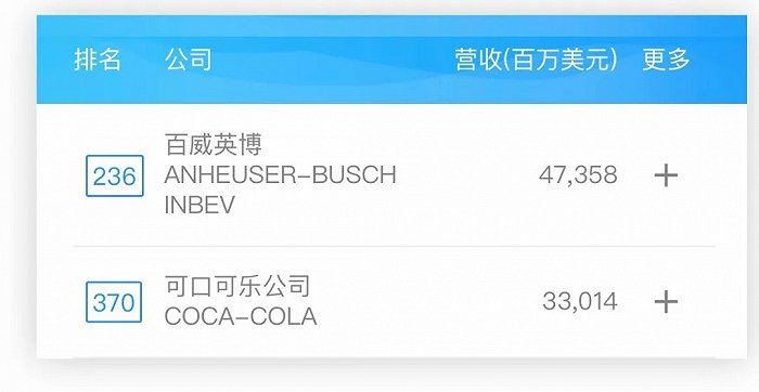 其中,百威英博以473.58亿美元的营收排在首位,可口可乐以330.14亿美元的营收紧随其后,今年分别名列第236和第370名,去年则分别为205名和335名。