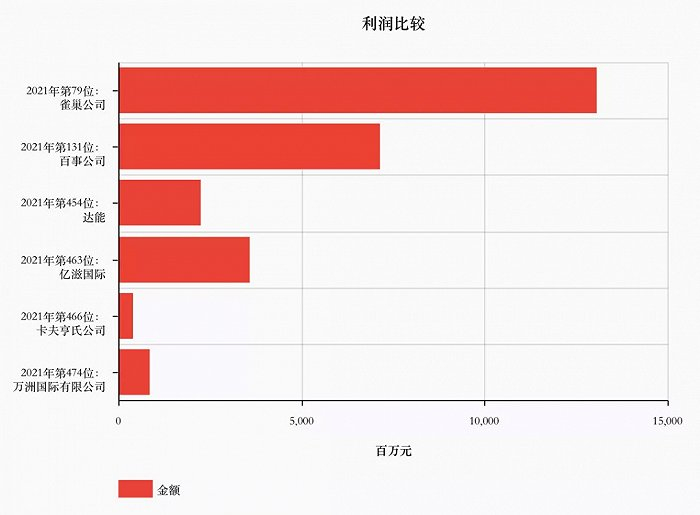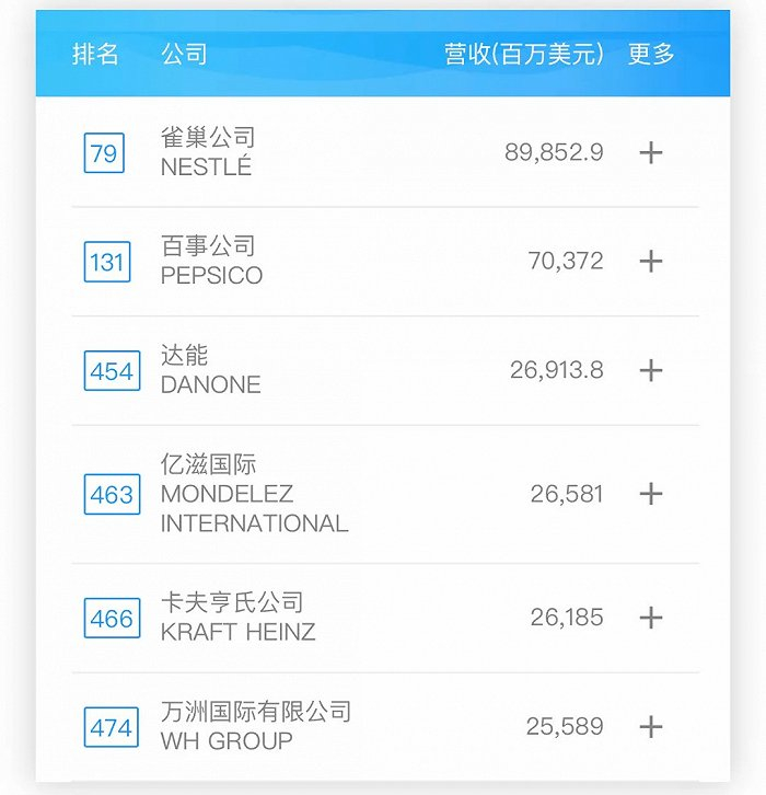 若从利润角度来排名,则这6家公司的年利润从多到少依次是:雀巢、百事、亿滋国际、达能、万洲国际、卡夫亨氏。