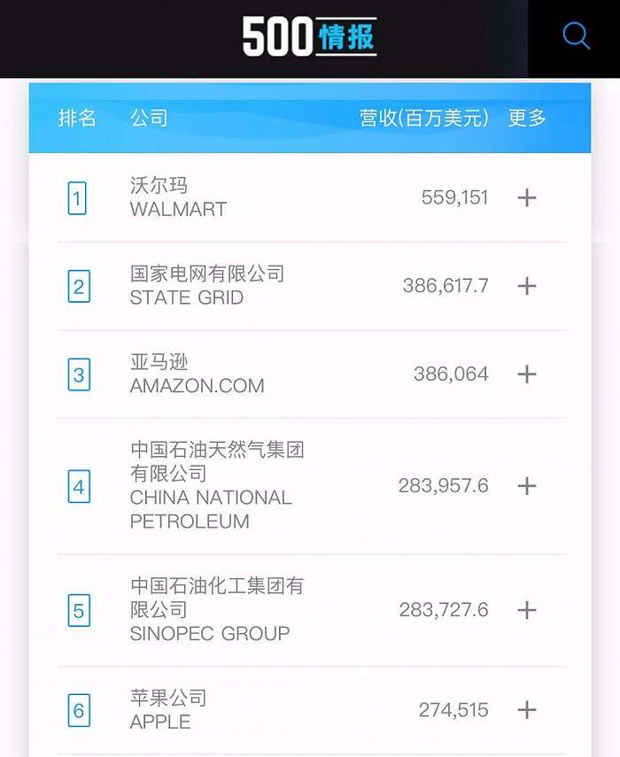 这是《财富》杂志连续第27次发布这份全球大公司排行榜。今年,沃尔玛连续第八年成为全球最大公司,中国的国家电网公司上升至第二位,亚马逊首次进入前三,苹果公司前进至第6位。在盈利方面,苹果以574亿美元的利润位居榜首。