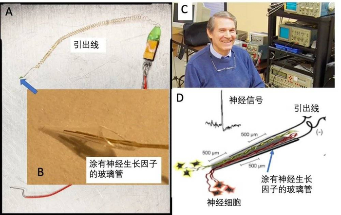 图6 菲尔·肯尼迪和他的神经生长电极 A 肯尼迪的神经生长电极,箭头所指的绿色锥形管是个吸引神经生长的玻璃管。B 玻璃管的放大照片,里面有两根记录电极。C 菲尔在他的实验室里,背后的仪器可以看出是1950-60年代的水平。D 神经生长电极的原理图,采自他2008年的文章。上面是实际记录到的神经发放,信号质量非常好,下面示意当电极埋入大脑皮层后,远处的神经细胞受生长因子的吸引长入玻璃管。