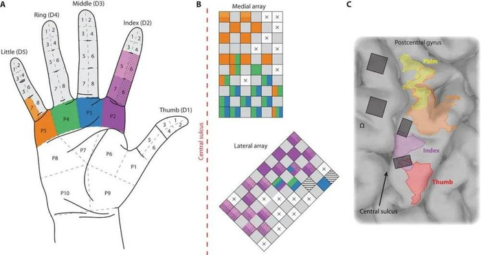 图3 用多个电极产生虚拟感觉 A 把假手的每个手指分成八个区域(1-8),把每个区域的压力传感器信号转化成电流通进一个电极。这样假手上不同位置的不同压力就能转化成对不同神经细胞的不同发放频率,以产生虚拟感觉。B 电极植入脑皮层的位置示意图,虚线代表脑皮层上的主要地标“中央沟”,中央沟后面就是身体感觉的手区。C 病人脑皮层上实际的感觉区与电极的相对位置。浅黄色为手掌感觉区,橘黄为小指区,淡紫色为食指区,红色为拇指区。灰色方块为电极阵的位置。从图中可以看出,植入电极的范围虽然远比手感觉区小,而且手指手掌的位置也和感觉区对不上。但是通过手眼结合的训练,病人逐渐能学会,产生逼真的虚拟感觉。(图源:Flesher et al., Sci. Transl. Med. 8, 361ra141 (2016) )