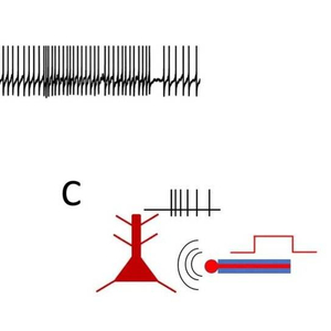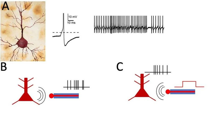 我们知道神经细胞利用电信号来相互通讯。神经细胞的电信号是短促的放电(图1A),听起来像收音机里劈劈啪啪的静电噪声。如果在神经细胞旁边放一个电极,就可以接收到神经的放电(图1B)。同样,这个电极也可以把外界的电流送过来,这个神经细胞受电流影响就会放电(图1C)。这样,电极与神经细胞之间就实现了双向的收发通讯。这个双向通讯从大脑的角度看,神经细胞接受外部电流引起放电就叫产生“感觉(sensory)”,而神经细胞放的电通过电极送出去就导致了“运动(motor)”。