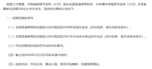 实际上,根据可追溯到的最早公开资料,河南烟草专卖局等在2008年已公开向社会招聘。