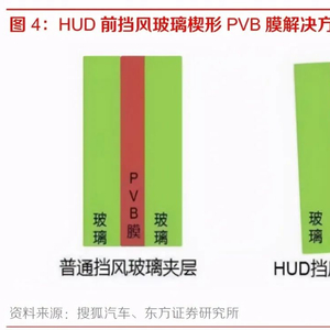 (2)特殊挡风玻璃。普通的前挡风玻璃使用夹层结构,由双层玻璃与内部 PVB 夹层组成,如果 将 HUD 图像直接投射到前挡风玻璃上容易出现重影,影响显示效果,因此需要对挡风玻璃进行特 殊处理。目前的主流解决方案有两种: