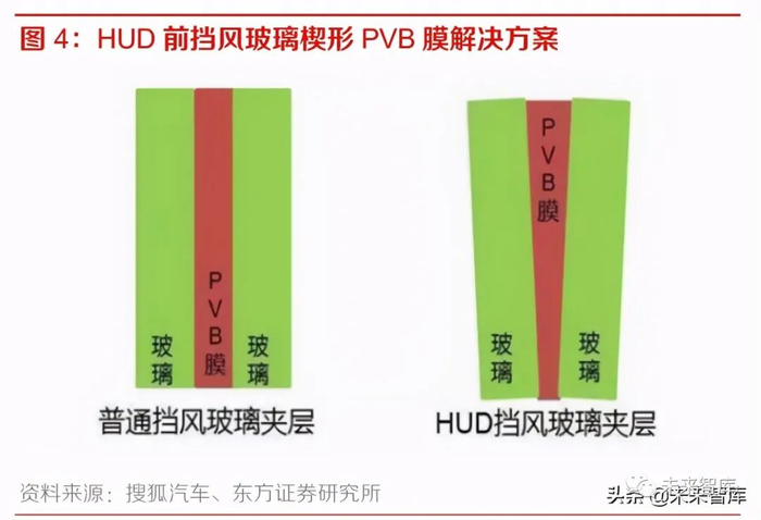 ① 楔形 PVB 膜方案。将 HUD 前挡风玻璃的内部 PVB 膜 制成楔形,使挡风玻璃呈现上厚下薄的形态,能够消除重影现象。