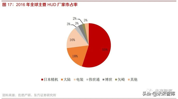 从全球范围看,HUD 行业的市场集中度很高,以德国、日本、美国企业为主。日本精机作为全球 HUD 龙头企业,占据全球 HUD 领域 55%的市场份额,大幅领先其他企业;其次是德国大陆,占 据 18%的市场份额;日本电装占据 16%的市场份额,其他企业如美国伟世通、德国博世及日本矢 崎均占据小部分份额,综合来看,全球前六大 HUD 厂商占据 HUD 行业 97%的市场份额,行业集 中度很高。