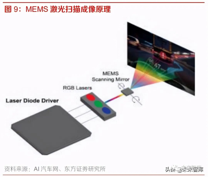 MEMS 激光扫描投影是将激光模组与微机电系统(Micro-Electro-Mechanical Systems,MEMS) 结合的投影显示技术方案。MEMS 投影技术属于扫描式投影显示,在 MEMS 扫描振镜扫过显示区 域时 RGB 彩色激光二极管将同步施以脉冲,将图像直接投射于挡风玻璃上。MEMS 投影技术采 用聚焦的激光束投射图像,不需要重新对焦,因此能大幅度简化光学系统的尺寸和复杂度、降低 整体成本,同时实现较高的对比度和亮度。