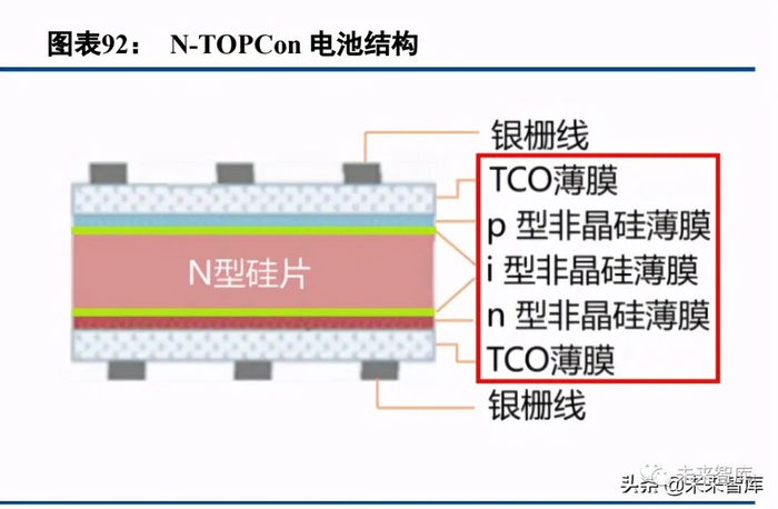 1)TOPCon 全称隧穿氧化钝化接触电池,是以 PERC 电池结构为基础,将 P 形硅片基底替换为 N 型硅片, 并在背面金属电极接触区域,制备一层超薄隧穿氧化层和高掺杂的多晶硅薄膜,形成钝化接触结构。