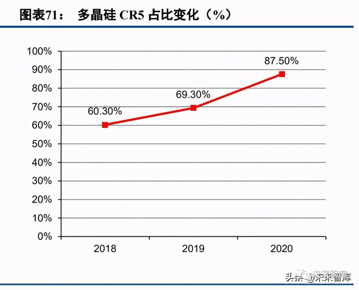 从行业格局来看,近年来我国多晶硅市场集中度不断提高,龙头集中趋势显著。2020 年中国多晶硅行业前 五企业市场占有率为 87.5%,较 2019 年提升了 18.2 个百分点,2020 年产量 5 万吨以上企业达到 4 家。