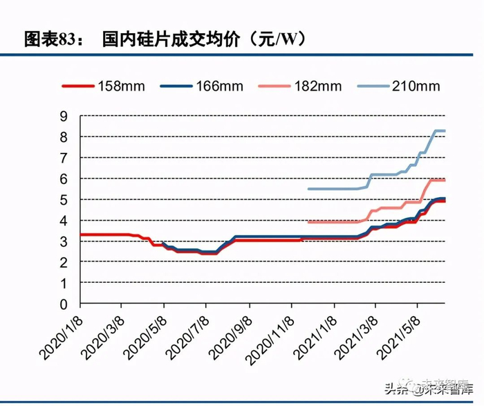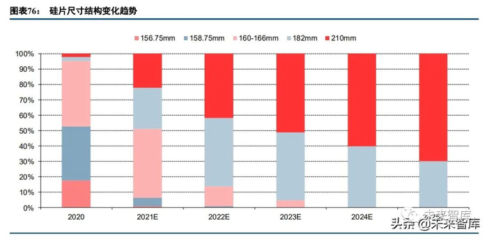 技术迭代上,硅片环节目前大尺寸高功率产品将进入快速放量阶段,硅片-电池-组件企业已加速布局 182、 210 尺寸产品。据中国光伏行业协会的统计预测,2020 年 158.75mm 尺寸硅片市场占比超过 50%,182mm 以上 尺寸硅片占比不超过 10%,我们预计到 2021 年底,210+182 出货占比会达到 50%,未来 2 年 210+182 会成为市 场主流。